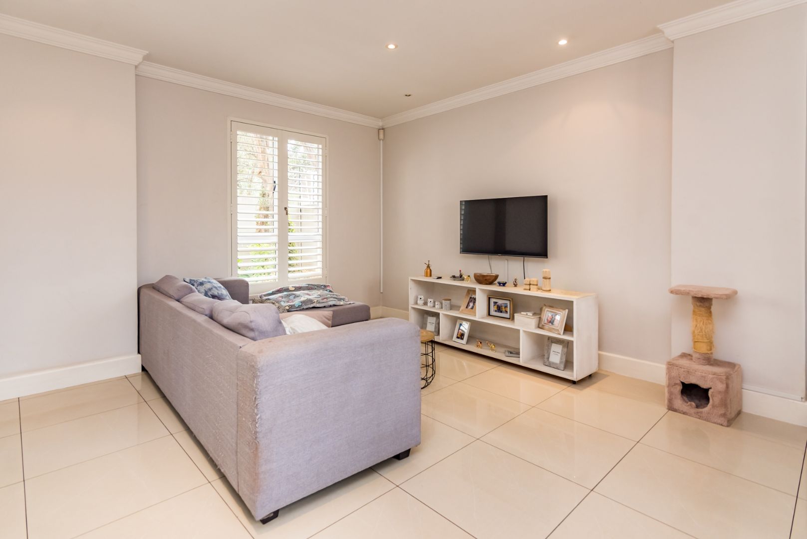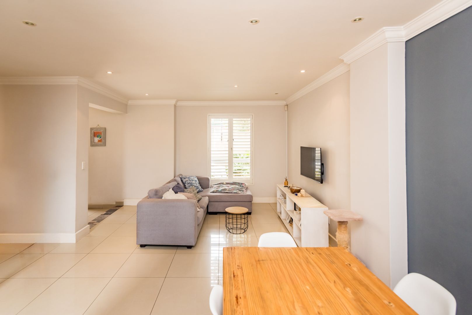 Open-Plan Living: The light-filled living area features stylish American shutters and flows seamlessly into the open-plan kitchen with granite worktops, a gas hob, and generous workspace—perfect for hosting or daily living.