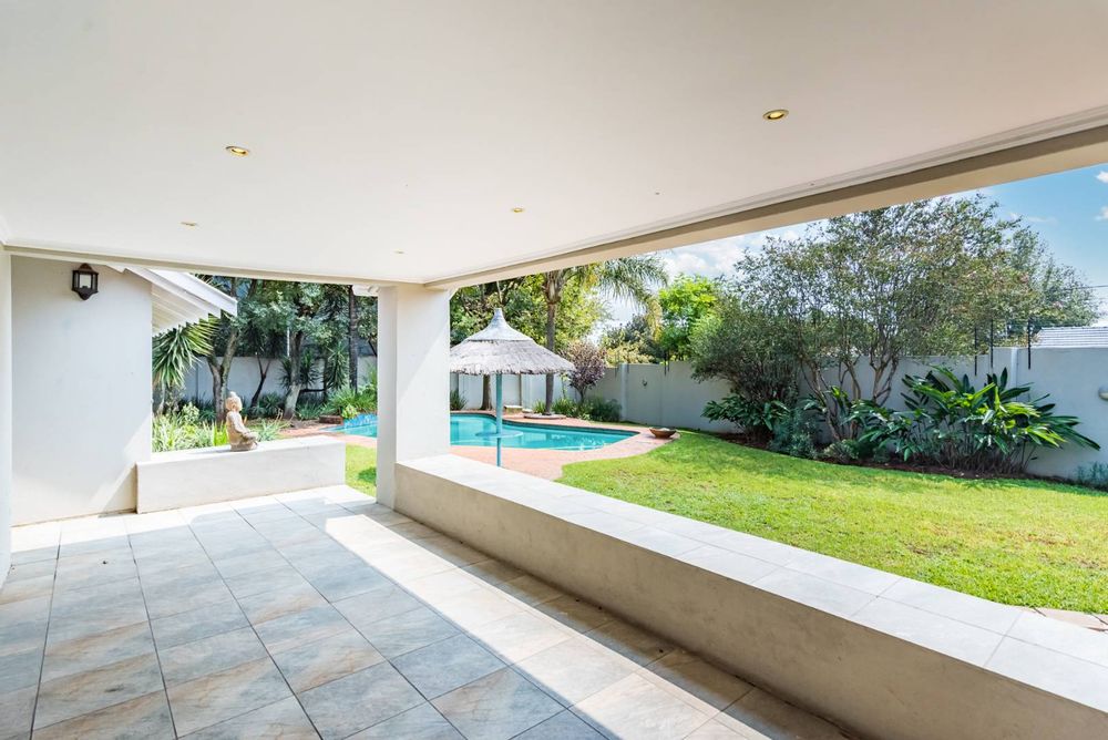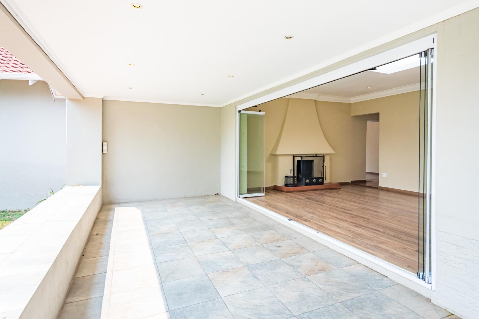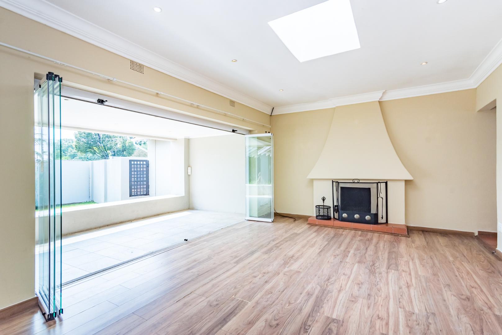 Living area with a fireplace has stack doors leading to the covered patio overlooking the garden and pool.